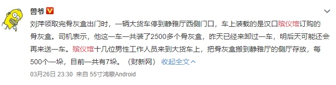 除此之外,報導中也提到,一位運輸骨灰盒的貨車司機表示,他這一車一共裝了2500多個骨灰盒,昨天已經來卸過一車。殯儀館十幾位男性工作人員來到大貨車上,把骨灰盒搬到靜雅廳的側廳存放,每500個一堆,目前一共有7堆。