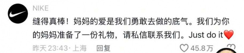 貼文曝光後,引發網友討論,「要我就把這個花樣的版權買下來」、「原來最貴的奢侈品是愛」、「媽媽的手真巧」、「滿滿的愛」,甚至NIKE官方也在底下留言:「縫得真棒,媽媽的愛是我們勇敢去做的底氣,我們為你的媽媽準備了一份禮物」,並要劉男聯絡他們,「just do it」。