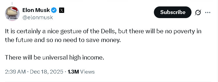(2025/12/15 17:13)馬斯克預言:AI時代「不需要再存錢」 全民高收入來臨