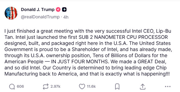 川普表示,英特爾近期推出的最新CPU(中央處理器,Central Processing Unit)屬於「SUB 2 Nanometer(次2奈米)」等級,對應業界所稱的18A製程技術,且從設計、製造到封裝皆在美國完成,象徵半導體供應鏈戰略回流本土。他並強調,美國政府以股東身分參與英特爾,僅僅4個月內,透過持股已為美國人民帶來數百億美元收益,「這是一筆極佳的交易,對英特爾同樣如此受益。我們的國家決心把最先進的晶片製造帶回美國,而這正確實在發生中!」