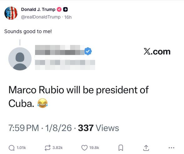 不僅如此,川普11日還轉發一則網友貼文,網友稱美國國務卿魯比歐(Marco Rubio)將成為古巴總統,川普還回應「聽起來不錯」,再度引發對美國拉美政策強硬化的聯想。