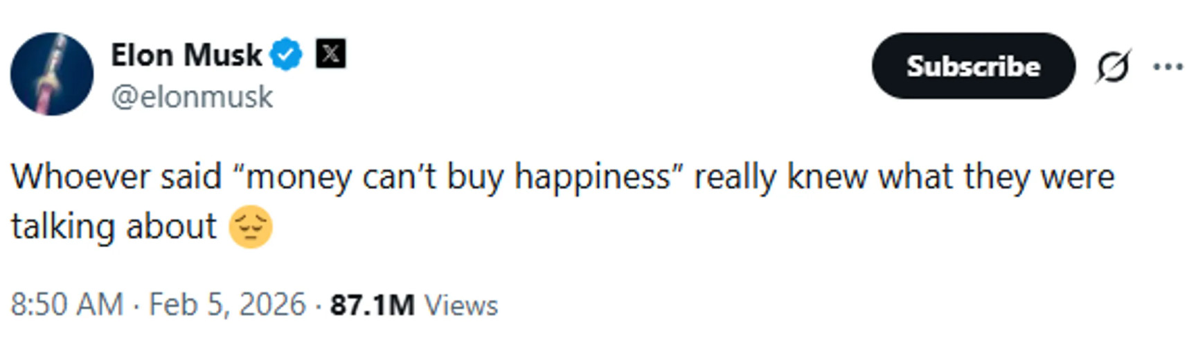 (2026/02/04 12:41)身價27兆不快樂? 馬斯克憂鬱發文:金錢買不到