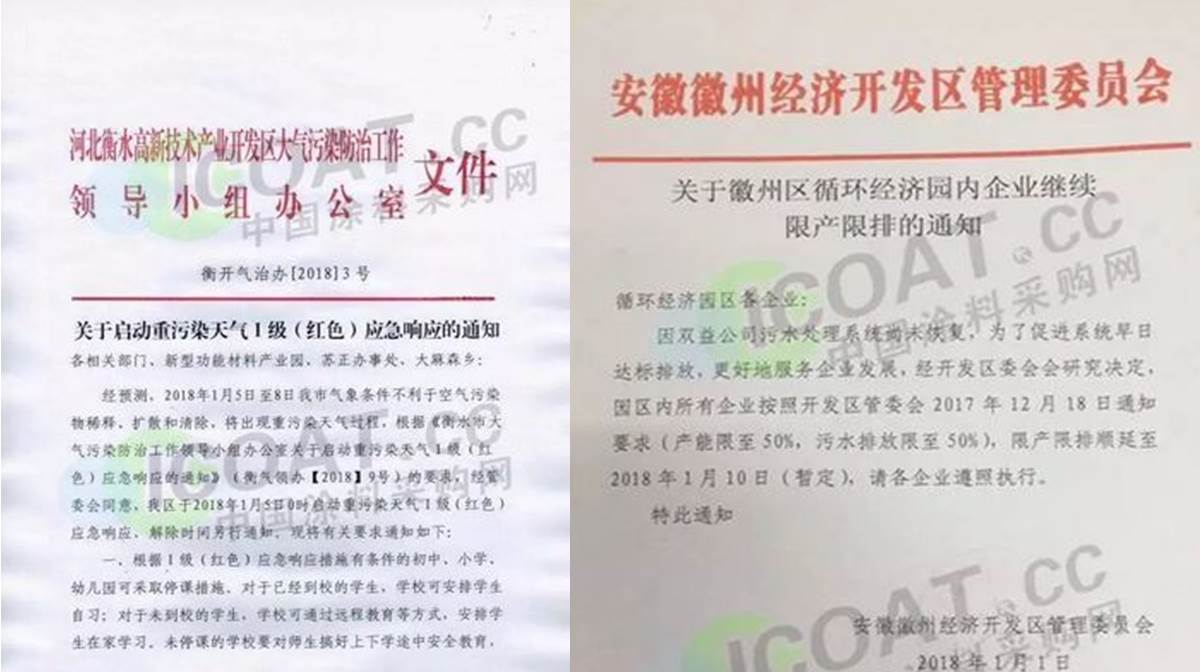 「安徽徽州」經濟開發區管理委員會下發通知要求:園區內所有企業產能限至50%,污水排放限至50%,限產限排延至2018年1月10日預計此次環境治理工作又將引發部分原材料價格波動。