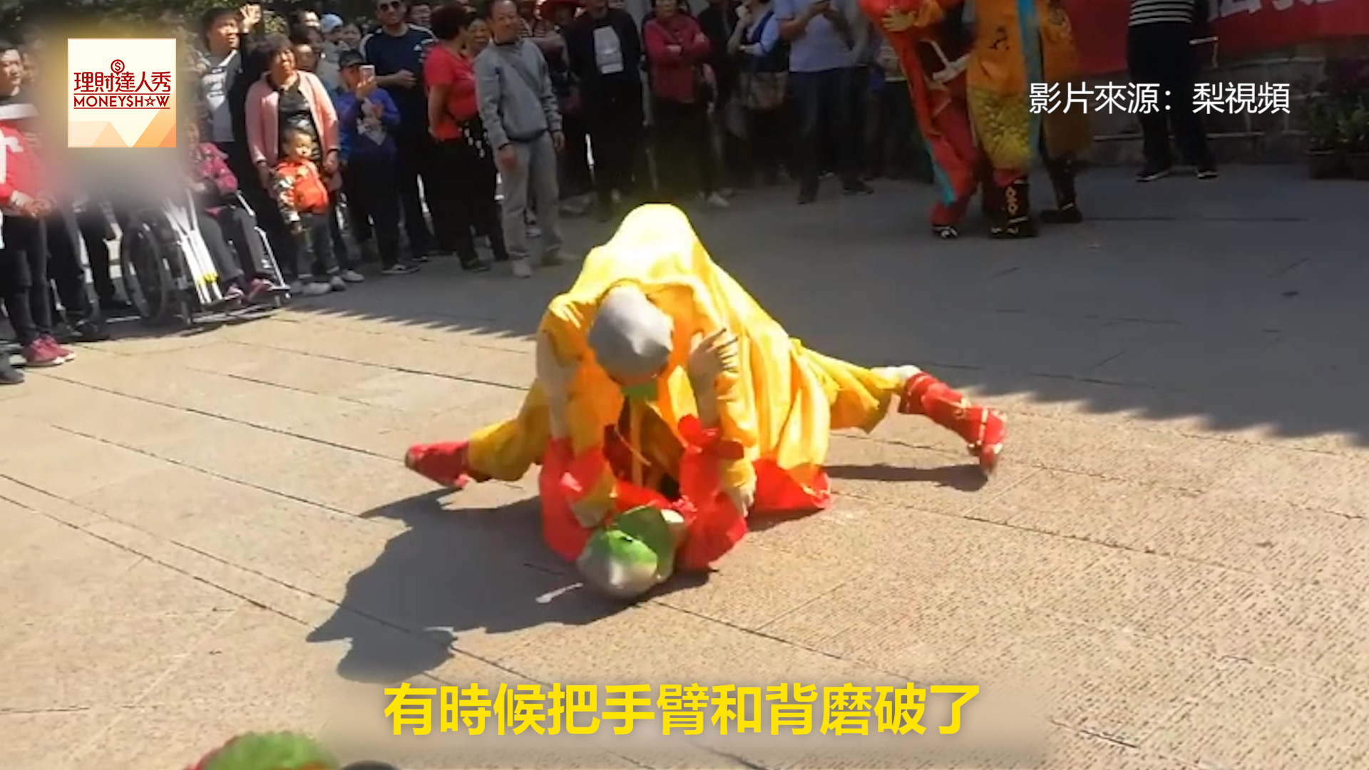 ▲就算把背跟手臂都磨破了,師愛軍仍堅持演出。(圖/梨視頻)