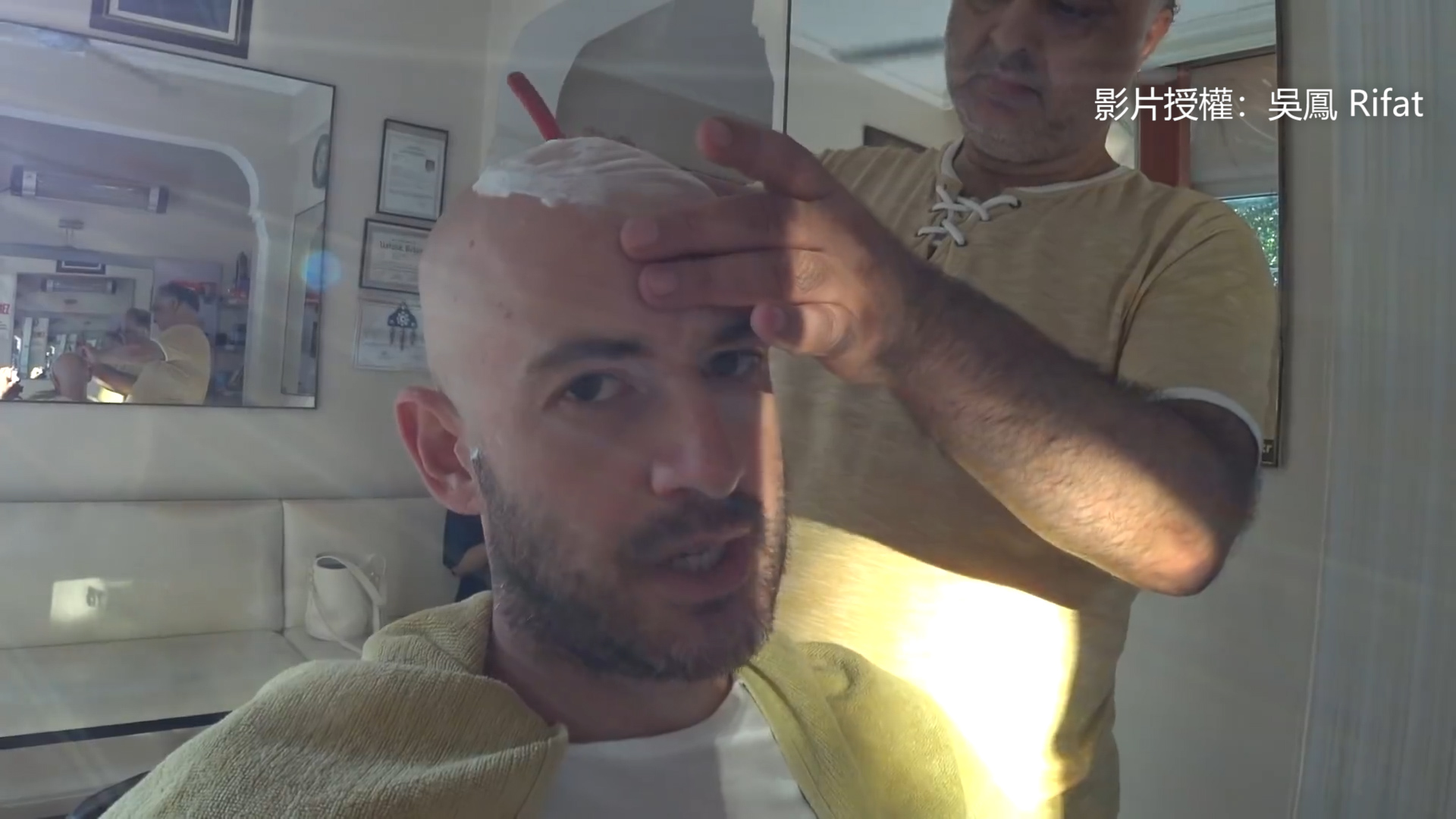順利剃成光頭後,再來就是「刮鬍子」,吳鳳提到在土耳其,剃刀稱為「ustura」。雖然也有看過台灣的傳統理髮,但吳鳳認為氣氛跟土耳其的不太一樣。